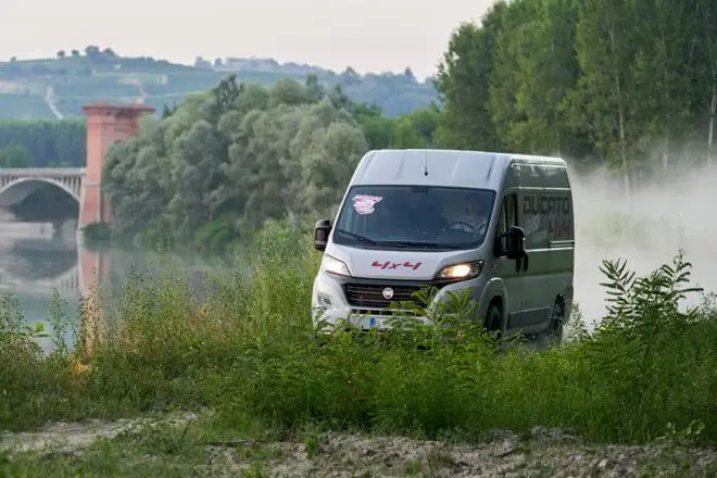 Eine zusätzlich angetriebene Hinterachse macht den Beststeller von Fiat Professional fit für Touren abseits befestigter Wege. Der Vierradantrieb ist verfügbar für die Modelle Ducato Light und Ducato Maxi sowie die Karosserievarianten Kastenwagen, Fahrgestell und Kombi N1.