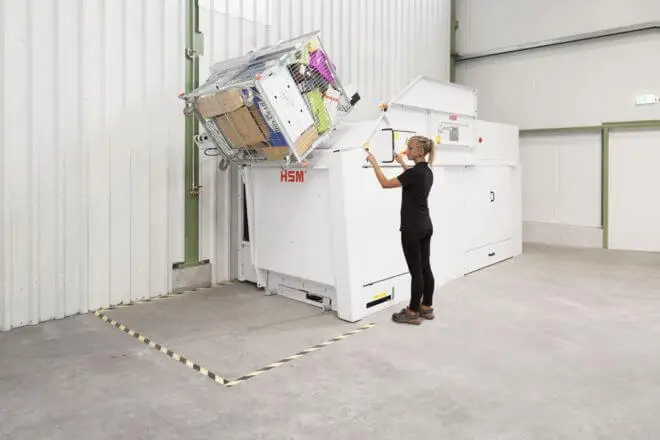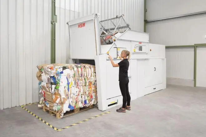 Mit der technischen Ausstattung, dem Bedienkonzept und der Auslegung für sperrige Kartonagen ist die horizontale Ballenpresse HSM HL 7009 die optimale Maschine für Filialisten und im Handel. Mit einer äußerst hohen Presskraft von 700 kN eignet sich die HSM HL 7009 für Kartonagen aber auch für die Verpressung von Folien. Der hoch verdichtete Ballen, je nach Material, erreicht ein Gewicht von bis zu 600 kg, hat ein Ballenmaß von ca. 1100 x 1100 x 1200 mm und wird von einer 4-fach Draht-Umreifung zusammengehalten. Die optimalen Ballenabmessungen und Ballengewichte garantieren eine wirtschaftliche LKW-Auslastung. Die Befüllung erfolgt komfortabel mittels einer hydraulischen Hub-Kipp-Vorrichtung. Auch bei der Ballenentnahme ist dank der hydraulischen Schiebetüre für höchsten Bedienkomfort und -sicherheit gesorgt.