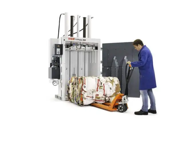 Die Vertikalballenpresse HSM V-Press 860 L produziert Ballen mit einer Aussparung für einen einfachen Transport ohne Palette. Die Ballen können direkt mit einem Gabelhubwagen oder Stapler bewegt werden. Die HSM V-Press 860 L ist ausgestattet mit der speziell entwickelten Eilgang-Technologie. Damit werden der Stromverbrauch und die Antriebsleistung deutlich reduziert und das bei gleichzeitiger Steigerung der Durchsatzleistung. Die Taktzeit verringert sich bei dieser Technologie um bis zu 40 Prozent im Vergleich zu herkömmlichen Antrieben. Aufgrund einer speziellen Pumpentechnik sind die Maschinen dabei besonders leise. Sie verpresst, dank einer Presskraft von 548 kN und der äußerst stabilen Pressplattenführung, mühelos gebrauchtes Verpackungsmaterial wie Kartonagen und Folien. Die Ballen erreichen ein Gewicht von bis zu 460 kg und werden serienmäßig von einer 4-fach Drahtumreifung, optional ist auch eine Polyesterband-Umreifung möglich, zusammengehalten. Die HSM V-Press Baureihe verbindet den Qualitätsanspruch von HSM mit hoher Rentabilität. Ihre Leistung und Langlebigkeit machen sie zur wirtschaftlichen Entsorgungslösung: Die Vertikalballenpresse HSM V-Press reduziert Kosten bei der meist unterschätzten Kostenstelle „Abfallbeseitigung“.