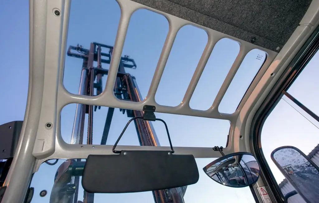 Der Stapler ist mit einer sehr geräumigen Kabine ausgestattet. Die Bedienung ist äußerst angenehm und präzise. Dank einer intelligenten Positionierung der Schläuche und Ketten sowie einem großen Sichtfenster im Fahrerschutzdach, ist der Blick auf Last und Umgebung gut. Trotz hoher Geräumigkeit und starker Leistung zeigt sich die Maschine des 5-Tonners im Test kompakt und wendig.